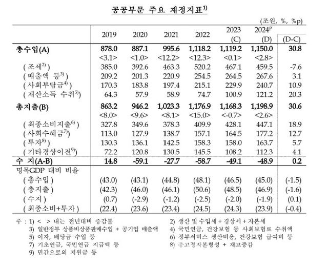 한편, 2023년 공공부문 적자 규모는 기존 46조 400억원에서 49조 1000억원으로 늘었다. 지난해 9월 잠정치 추계 시 활용하지 못한 일반정부 및 공기업의 결산자료 등을 추가 반영하면서다. 총수입은 12조 5000억원, 총지출은 15조 2000억원 각각 늘었다.