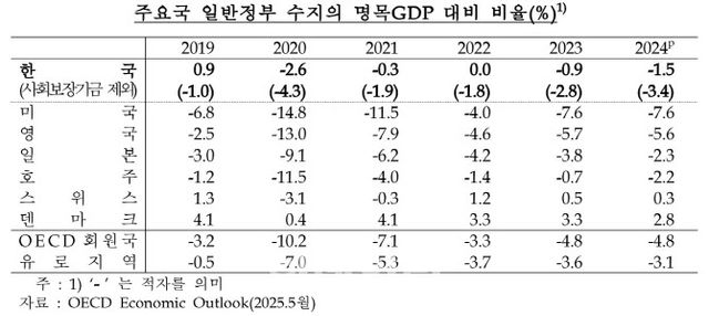 한은은 우리나라 경제규모 대비 일반정부 수지 비율은 주요국들과 비교해 양호한 수준이라고 평가했다. 명목 국내총생산(GDP) 대비 일반정부 수지 비율은 지난해 -1.5%(사회보장기금 제외 -3.4%)로, 경제협력개발기구(OECD) 회원국 평균치인 -4.8%를 웃돌았다. 이 비율이 마이너스를 나타내는 것은 총수입보다 총지출이 많은 적자 상태를 의미한다. △미국(-7.6%) 영국(-5.6%) △유로존(-3.1%) △일본(-2.3%) 은 적자 비율이 우리나라보다 높았다.