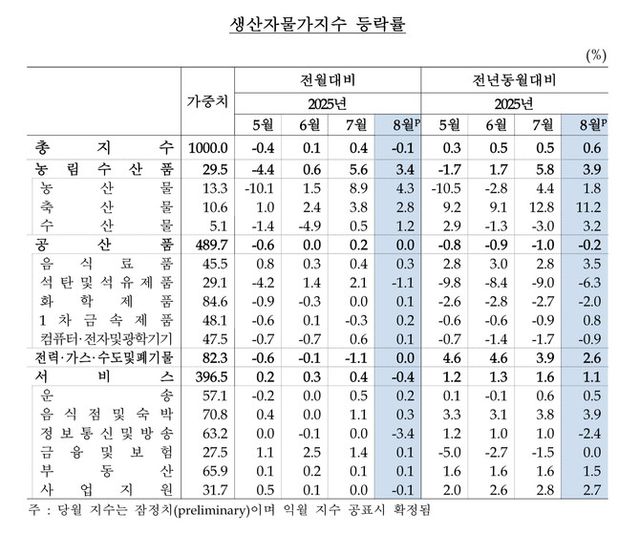 공산품은 보합세를 보였다. 석탄·석유제품(-1.1%) 등이 내렸음에도 음료품(0.3%) 등이 상승한 영향이다. 전력·가스·수도 및 폐기물은 지난달과 같은 수치를 나타냈다.