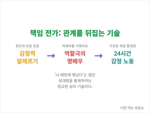 이것이 책임 전가의 가장 교활하고 위험한 측면이다. “네가 나를 화나게 만들었다”는 말은, 뒤집어보면 “네가 나를 화나지 않게 만들 수도 있다”는 뜻을 내포한다. 그는 자신의 감정 조절 리모컨을 당신의 손에 쥐여주는 척한다.