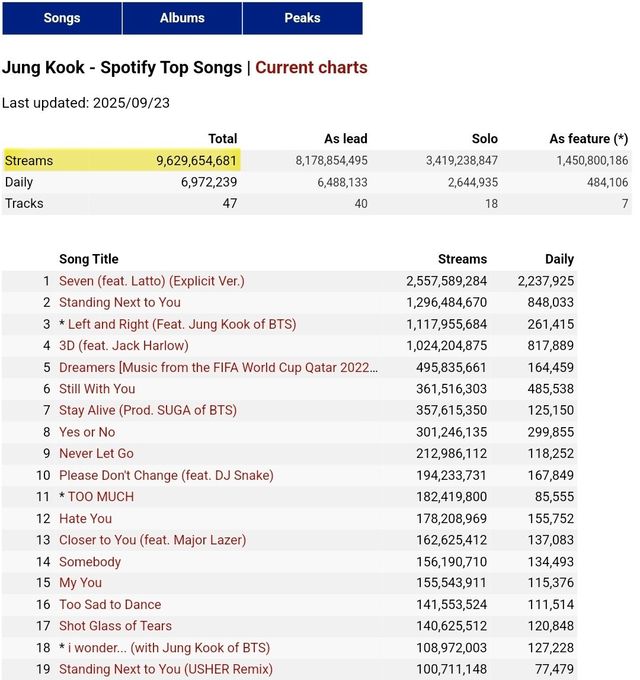 곡별 스트리밍 순위는 ‘Seven’이 25억 5000만 이상으로 가장 높고, 이어 ‘Standing Next to You’(12억 9000만 이상), ‘Left and Right’(11억 1000만 이상), ‘3D’(10억 이상), ‘Dreamers’(4억 9000만 이상), ‘Still With You’(3억 6000만 이상) 순으로 기록 중이다.