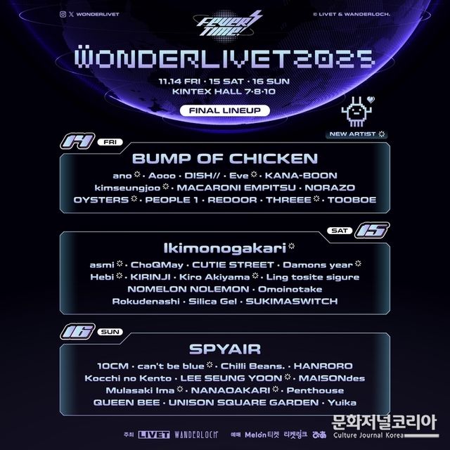 앞서 공개된 14일 금요일 헤드라이너는 ‘뮤지션들의 뮤지션’이라 불리는 일본 록밴드 BUMP OF CHICKEN(범프 오브 치킨)이 이름을 올렸고, 16일 일요일 헤드라이너로는 일본 인기 애니메이션 ‘은혼’, ‘하이큐!!’ OST로 큰 사랑을 받아온 SPYAIR(스파이에어)가 ‘원더리벳 2025’ 무대를 빛낸다.