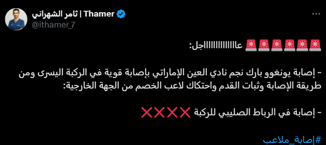 중동의 저명한 스포츠 물리치료사 타메르 알샤라니는 26일 자신의 SNS에 "긴급 속보. UAE 클럽 알아인의 스타 선수 박용우가 왼쪽 무릎에 심각한 부상을 입었다. 부상 경위, 발의 안정성, 그리고 상대 선수와의 외부 접촉을 종합적으로 고려했을 때 무릎 십자인대 손상으로 보인다"고 전했다.