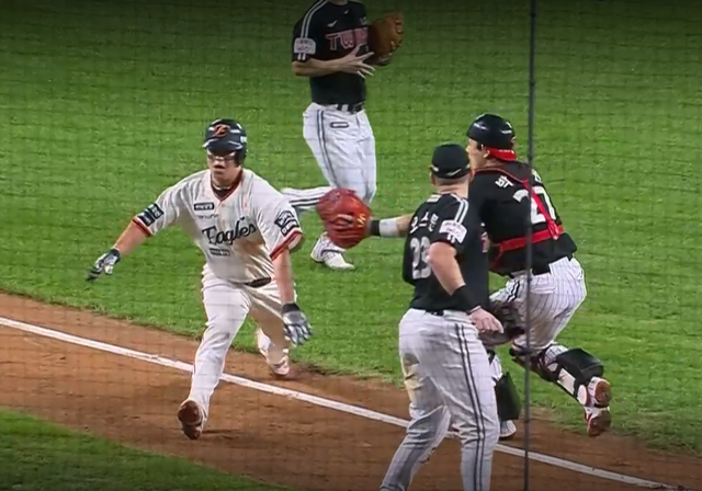 그리고 이어진 하주석과 김영우의 승부, 하주석은 김영우의 초구 슬라이더를 지켜본 뒤 2구 직구에 기습번트를 시도했다. 그러나 번트 타구의 속도가 죽지 않으면서 김영우가 곧바로 이 공을 포구했다. 이미 3루주자 노시환이 출발을 한 상황, 홈으로 송구해 런다운 플레이를 만들거나 직접 태그했다면 아웃카운트 하나로 끝날 상황이었다.