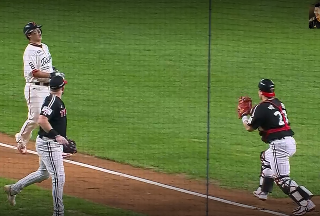 그런데 2루주자가 3루로 뛰어드는 것을 본 김영우가 공을 홈이 아닌 3루로 송구했다. 김영우를 피해 귀루하려던 노시환도 공이 3루로 향하자 다시 홈을 향해 내달렸다. 다시 공이 포수 박동원에게 오자 노시환은 포기한 듯 천천히 달리다가, 몸을 비틀어 박동원을 피해 홈으로 들어갔다.