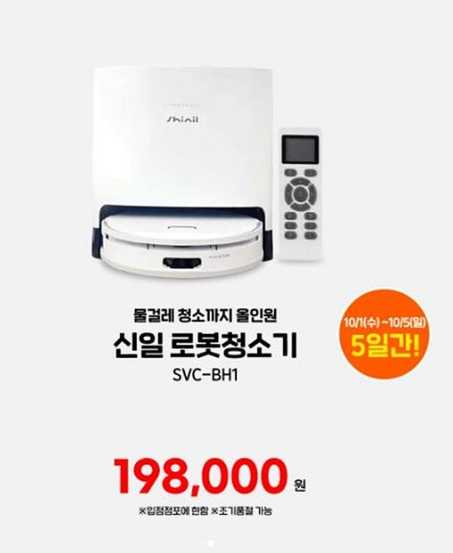 특히 이번 행사 기간에 신일전자가 만든 '신일 로봇청소기'를 특가에 판매한다. 모델명은 SVC-BH1이다. 10월 1일부터 10월 5일까지 5일간 이 제품을 특가인 19만 8000원에 구매할 수 있다. 이마트는 해당 제품을 입점 점포에 한해 특가에 판매하며 조기 품절 가능성이 있다고 설명했다.