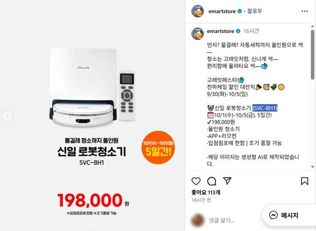 이마트 인스타그램에 올라온 '신일 로봇청소기' 특가 행사 안내 게시물