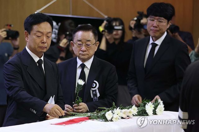 28일 서울 송파구 서울아산병원 장례식장에서 엄수된 개그맨 전유성의 영결식에서 코미디언 김학래, 이홍렬, 표인봉이 헌화하고 있다. / 연합뉴스