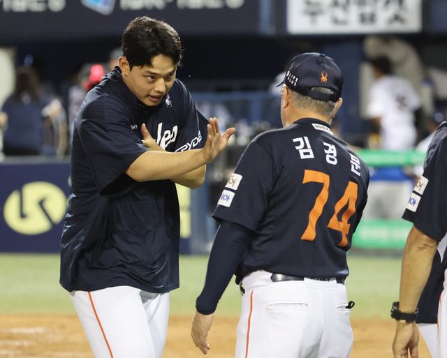 2025 KBO리그 프로야구 두산베어스와 한화이글스의 경기가 22일 오후 서울 잠실야구장에서 열려 한화의 2대 1 승리로 끝났다. 경기 후 선발 문동주가 김경문 감독과 하이파이브를 하고 있다. 잠실=김민규 기자 mgkim1@edaily.co.kr /2025.07.22/