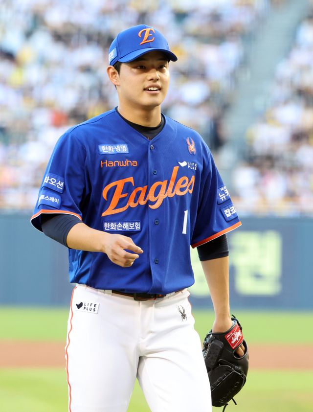 10일 오후 잠실야구장에서 열린 2025 프로야구 한화와 LG 경기. 한화 선발 문동주가 3회 LG 공격을 막고 들어오며 미소 짓고 있다. 잠실=정시종 기자 capa@edaily.co.kr /2025.08.10.