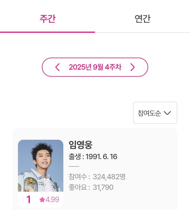 29일 아이돌차트에 따르면 임영웅은 9월 22일부터 28일까지 집계된 평점랭킹에서 32만4482표를 얻으며 최다득표를 기록했다. 이로써 235주 연속 1위라는 대기록을 이어가게 됐다.