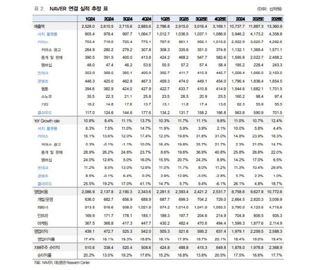 이 연구원은 “현재 네이버 본업의 성장 모멘텀은 약화된 상황”이라며 “지난 2분기 실적에서 검색 광고 매출 성장률 둔화가 확인됐고 가장 매출 비중이 큰 광고 성장률 둔화에 전사 매출 성장률 역시 둔화됐다”고 지적했다.