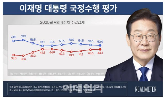 29일 여론조사 전문기관 리얼미터가 에너지경제신문 의뢰로 실시한 이달 4주차 주간 집계에 따르면, 대통령 국정수행 지지율은 전주 대비 1.0%포인트(p) 감소한 52%로 나타났다. ‘매우 잘함’ 41.4%, ‘잘하는 편’ 10.5% 등으로 집계됐다. 반면 부정 평가는 0.5%p 상승한 44.1%로, ‘매우 잘못함’ 35.8%, ‘잘못하는 편’ 8.3% 등으로 나타났다. ‘잘 모름’은 4.0%였다.