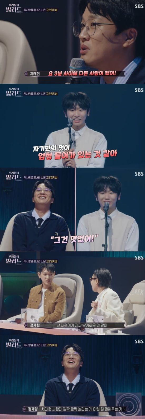 그런데 차태현은 "노래를 하기 전과, 노래를 끝낸 3분 사이에 갑자기 멋이 엄청 들어갔다. 이제 장점이 될 수도 있겠지만 이제 고2니까 이런 멋이 조금 없어도 된다"고 말했다.