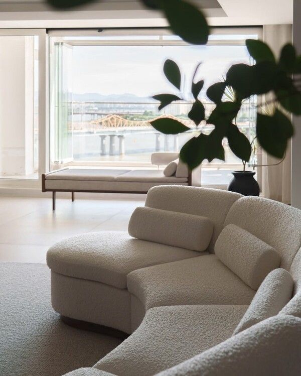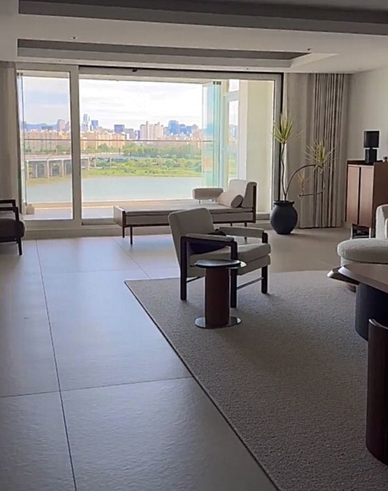 공개된 사진 속 신혼집은 한강뷰를 자랑하는 초럭셔리한 공간이었다. 동양적인 콘셉트에 맞춰 깔끔하고 모던한 스타일의 소파와 가구들이 조화롭게 배치되어 있으며, 곳곳에 나무, 그림, 거울 등으로 감각적인 포인트를 주었다. 전체적으로 단정하면서도 고급스러운 효민만의 인테리어 감각이 돋보인다.