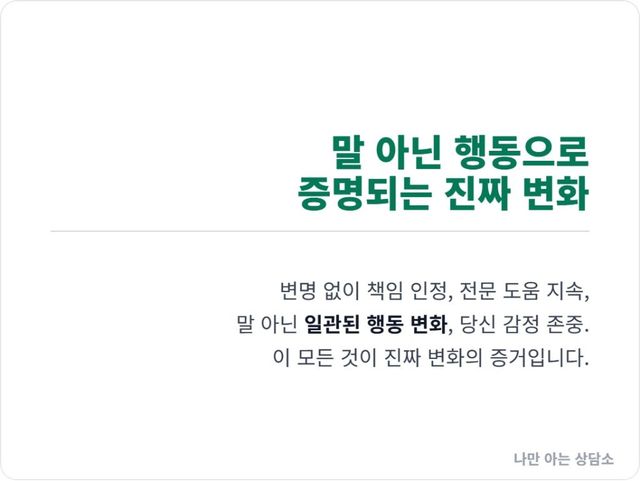 - - 진짜 변화: 그는 당신이 느끼는 고통과 트라우마를 방어적인 태도 없이 들어준다. 자신의 과거 행동이 남긴 상처가 쉽게 아물지 않음을 이해하고, 당신의 치유 과정을 인내심을 갖고 지지해 준다.