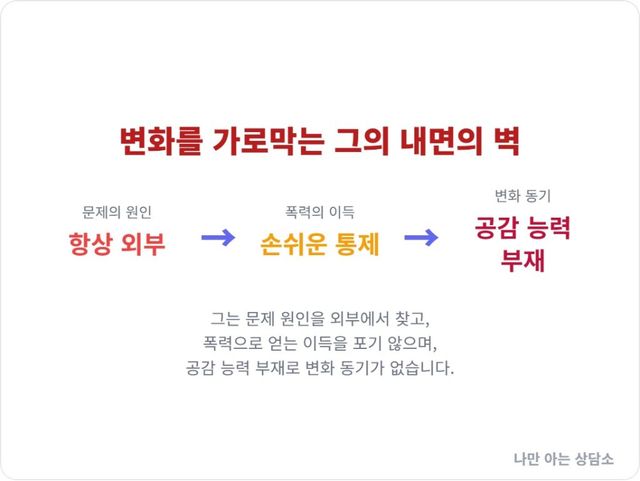 그에게 변화란, 이 손쉬운 지름길을 포기하고, 소통, 타협, 자기 성찰이라는 멀고 험난한 길을 걸어야 한다는 의미다. 대부분의 가해자는 그 수고로움을 감수하려 하지 않는다.