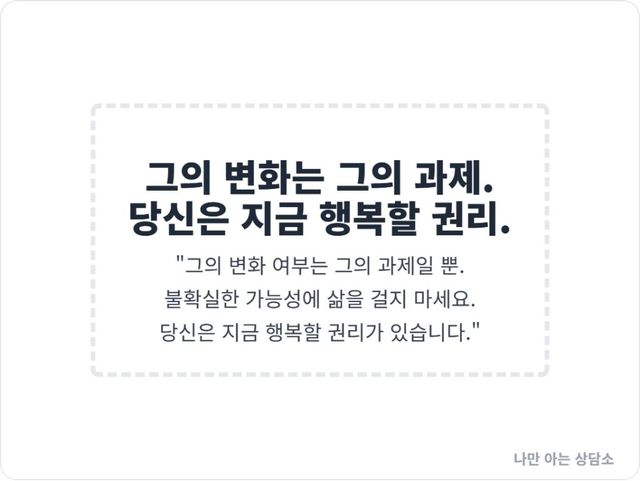 그가 변할 수 있느냐 없느냐는, 결국 그의 과제이지 당신의 과제가 아니다. 당신의 과제는, 그의 변화 여부와 상관없이, 당신 자신의 행복과 안전을 선택하는 것이다. 그의 변화를 기다리는 시간 속에 당신의 삶을 방치하지 마라. 당신은 누군가의 잠재적 변화를 위한 담보물이 아니라, 지금 여기에서 행복할 권리가 있는 온전한 존재다.