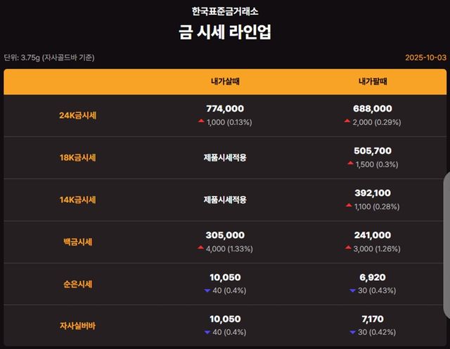 순금(24K) : 매입가 77만 5000원 / 매도가 68만 7000원