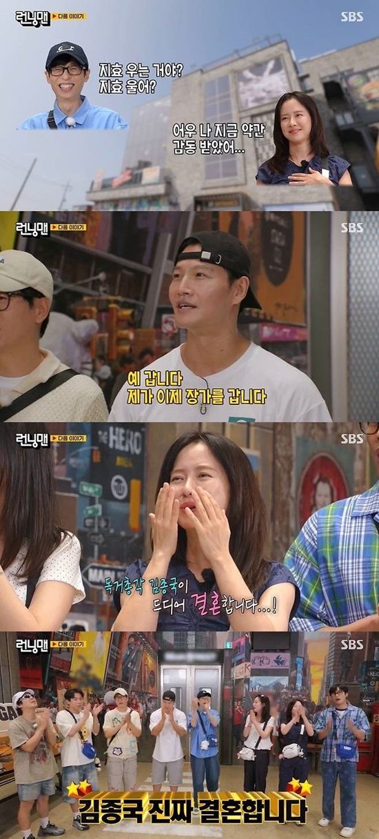 '런닝맨'에서 김종국과 러브라인 설정으로 재미를 주기도 했던 송지효는 김종국의 결혼 발표 당시 자신이 결혼 상대로 언급됐던 해프닝을 언급하며 "'왜 나라고 생각하지?' 싶었다"며 멋쩍어했다.