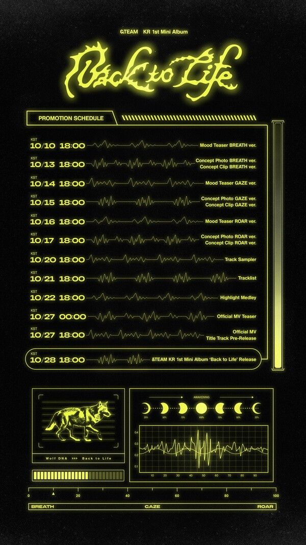 또한 '숨(BREATH)', '응시(GAZE)', '포효(ROAR)' 등의 키워드로 정의되는 &TEAM의 서사구조와 함께, 팀 정체성인 'Wolf DNA'와 'Back to Life' 문구가 새겨진 박스 플롯(Box Plot) 옆 달이 차오르면 이들이 'Awakening(각성)'한다는 표식은 이들의 열일행보와 반전을 암시하는 바로 주목된다.