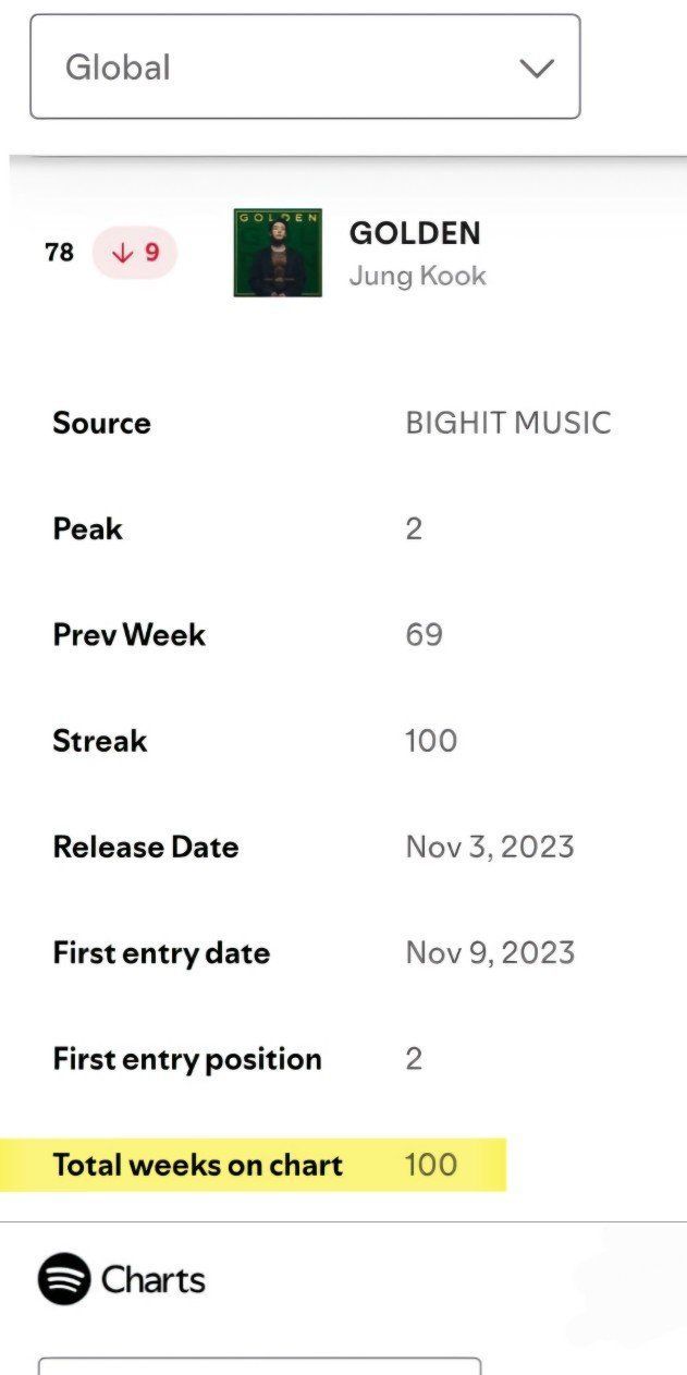 정국의 첫 솔로 앨범 ‘GOLDEN’이 스포티파이(Spotify) ‘위클리 톱 앨범 글로벌’ 차트에서 100주 연속 이름을 올렸다. 아시아 솔로 아티스트로는 ‘최초이자 유일한’ 기록. ‘골든’이자 ‘골든레전드’다.