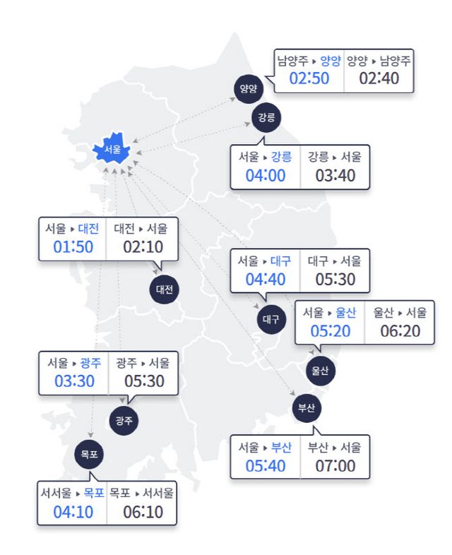 한국도로공사에 따르면 이날 10시 기준 각 도시 요금소에서 서울요금소까지 걸리는 예상 시간은 부산 7시간, 울산 6시간 20분, 목포 6시간 10분, 대구 5시간 30분, 광주 5시간 30분, 강릉 3시간 40분, 양양 2시간 40분, 대전 2시간 10분이다. 정오 기준으로는 최대 7시간 40분이 걸릴 전망이다.