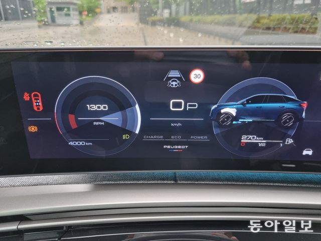 푸조의 ‘올 뉴 3008 스마트 하이브리드’에서 엔진과 전기모터의 구동 상황을 보여주는 디스플레이. 김도형 기자 dodo@donga.com