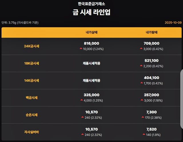 국내 거래소 금시세(금값)가 9일(이하 한국 시각) 오전 상승세(전 거래일 대비)를 보이고 있다.