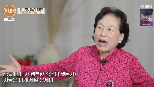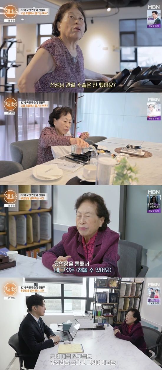 또한 전원주는 변호사와 유언장을 준비했다. 그는 “내 주변에 다들 작성하더라”라며 “가슴이 좀 떨렸는데 시원해지더라. 답답한 게 있으면 또 찾아오겠다”고 변호사에게 전했다. 이어 “죽을 때 행복하게 죽느냐가 문제다. 내가 노후까지 쓸 돈은 다 준비되어 있다”고 덧붙였다.