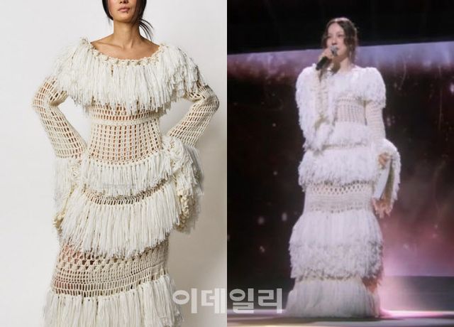 이효리는 지난 3일 공개된 저스트 메이크업 1화에서 MC로 화려하게 등장했다. 이날 이효리가 착용한 하얀색 의상은 전면적으로 핸드크로셰(손뜨개) 기법이 적용됐다. 또 넓게 트인 보트넥 라인을 따라 길게 늘어진 프린지(실을 꼬아 만든 술) 장식이 어깨선을 따라 흘러내리는 디자인이 특징이다. 상체부터 허리까지는 격자형 짜임으로 살결이 은근히 드러나는 시스루 형태를, 허리 라인은 세밀한 뜨개 패턴을 적용해 실루엣을 잡았다. 소매와 스커트 하단에도 프린지와 입체적인 조직감으로 마무리돼 전체적으로 풍성한 느낌을 준다.