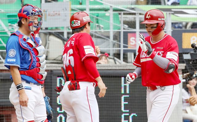1차전 7회 말 PS 데뷔전에서 홈런을 친 1루수 고명준은 2차전에서는 5번 타자로 나서 2회 말 첫 타석부터 아치를 그렸다. 삼성 선발 투수 헤르손 가라비토가 구사한 초구 체인지업을 공략해 가운데 담장을 넘겼다. 정규시즌 17홈런을 친 그는 PS에서 2개를 더하며 '시즌 기준' 20홈런을 눈앞에 뒀다.