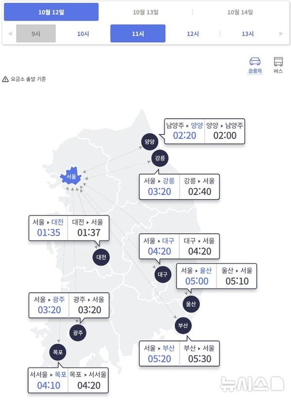 오전 11시 요금소 기준으로 승용차를 이용한 주요 도시 간 예상 소요시간은 하행선 ▲서울~부산 5시간20분 ▲서울~대구 4시간20분 ▲서울~광주 3시간20분 ▲서울~대전 1시간35분 ▲서울~강릉 3시간20분 ▲서울~울산 5시간 ▲서울~목포 4시간10분이다.