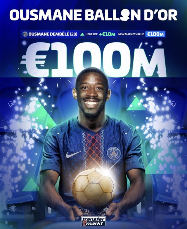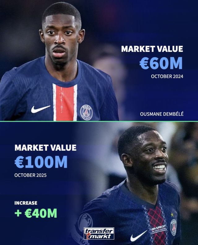 2025 발롱도르의 주인공인 우스만 뎀벨레도 1년 전보다 4000만 유로(666억원) 뛰며 몸값 1억 유로(1661억원)를 돌파했다.