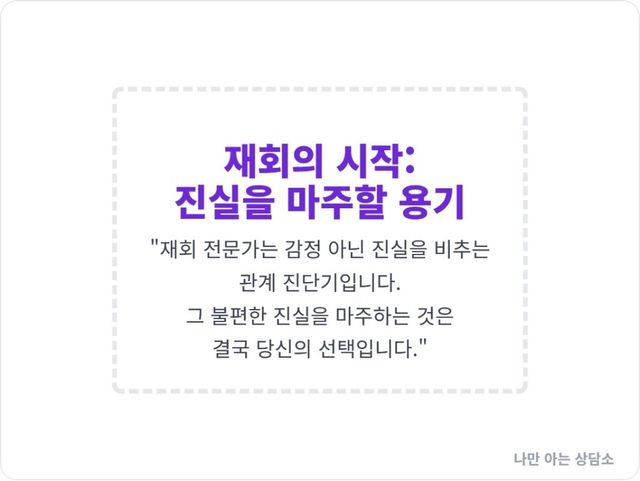 재회 과정에서 전문가의 역할은, 바로 이 관계 진단기와 같습니다. 그 눈은 당신의 감정에 흔들리지 않고, 당신의 서사에 속지 않으며, 당신의 관계 피부 아래 숨겨진 진짜 문제점들을 냉정하게 비춥니다.