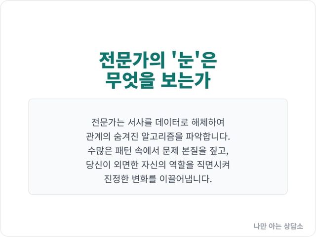 전문가는 이 모든 것을 수집하여, 당신이 구축한 서사의 이면에 숨겨진 진짜 ‘관계의 알고리즘’을 역추적한다. “그는 원래 무심한 사람이었어요”라는 당신의 진술은, “전형적인 회피형 애착 성향과 불안형 애착 성향의 충돌 패턴이군요”라는 객관적인 데이터로 번역된다.