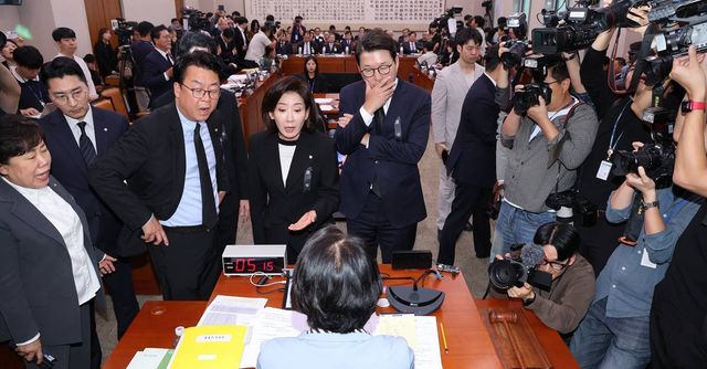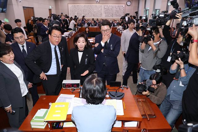 나경원 의원을 비롯한 국민의힘 법사위원들이 지난 13일 서울 여의도 국회에서 열린 법제사법위원회의 대법원 등에 대한 국정감사에서 조희대 대법원장 이석과 관련해 추미애 위원장에게 항의하고 있다 / 뉴스1