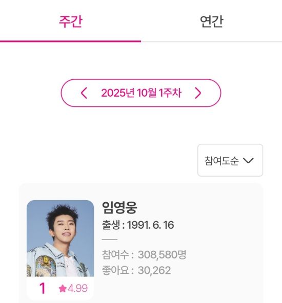 최근 아이돌차트에 따르면, 지난 10월 6일부터 10월 12일까지 집계된 평점랭킹에서 임영웅은 308,580표를 얻어 최다득표를 기록했다.