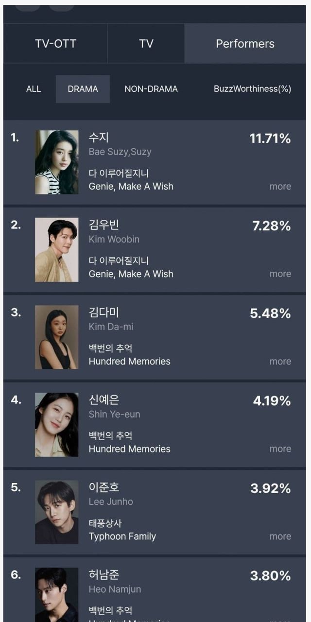 넷플 오리지널 전체공개로 2주 연속 1위하기 힘든데 수지 2주 연속 화제성 1위네요