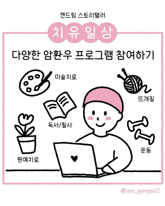 마음이 가라앉고 우울함과 두려움으로 가득 찰 때, 나는 다양한 암환우 대상 프로그램을 들으며 환우들과 소통하고 힐링했다. 공실이의 치유일상에서 앞서 적었던 글처럼 막항(마지막 항암치료) 후 무료한 일상에서 원예치료, 미술치료 등의 암환우 대상 프로그램을 접하고 더 건강하고 알찬 치유의 나날을 보냈다.