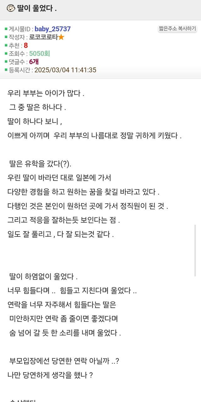 일본 취업한 딸이 엄마 전화 지친다며 운 썰