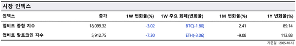 국내 가상화폐 거래소인 업비트(Upbit)를 운영하는 두나무의 ‘업비트 데이터랩 위클리 리포트(Upbit Datalab Weekly Report)’에 따르면 지난 10월 6일부터 일주일간 가상화폐 지수는 코스피와 함께 떨어졌고 나스닥 시장은 올랐다.