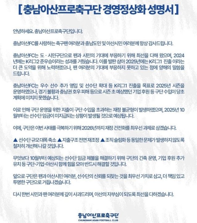 아울러 “10월부터 예상되는 선수단 임금 체불을 해결하기 위해 구단의 긴축 운영, 기업 후원 추가 유치 등 구단-기업-아산시가 함께 힘을 모아 반드시 해결하겠다”고 덧붙였다.