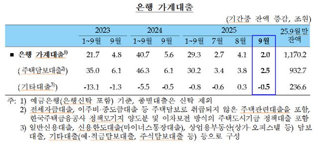 가계대출 중 주담대가 8월 3조 8000억원에서 9월 2조 5000억원으로 증가 폭이 축소됐고, 신용대출 등 기타대출이 3000억원에서 5000억원 감소로 전환됐다. 전세자금 대출도 2000억원 감소로 돌아섰다. 이는 지난해 3월(-1조 7000억원) 이후 1년 반만에 가장 낮은 수준이다.