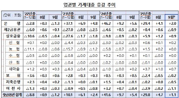 업권별로 보면 은행권 가계대출 증가 폭은 2조원으로 전달(4조1000억원)의 절반 수준으로 줄었다. 정책성 대출 증가 폭은 전달(1조1000억원)과 비슷했지만 은행 자체 주담대 증가 폭이 2조7000억원에서 1조4000억원으로 감소했다. 제2금융권 가계대출도 9000억원 줄며 감소세로 전환됐다. 상호금융권 가계대출 증가 폭이 전달 1조2000억원에서 9000억원으로 축소됐으며, 저축은행 증가 폭(-5000억원)도 감소세로 돌아섰다.