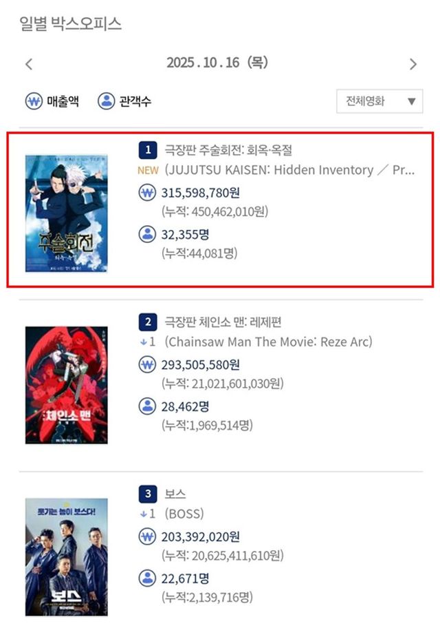 한편, 전날 ‘주술회전: 회옥·옥절’과 ‘극장판 체인소 맨: 레제편’에 이어 ‘보스’가 22,683명의 관객을 동원하며 박스오피스 3위를 차지했다. 그 뒤로 ‘어쩔수가없다'(15,912명), ‘원 배틀 애프터 어나더'(7,971명)이 박스오피스 상위권에 이름을 올렸다.