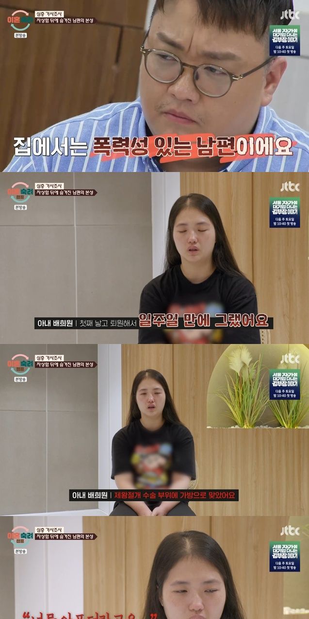 아내는 "첫째 낳고 퇴원해서 일주일 만에 그랬다. 제왕절개 수술 부위에 가방으로 맞았다. 너무 아프더라. 첫째 낳고 둘째 낳을 때까지만 해도 화가 나면 저를 많이 때렸다"며 당시 폭행 빈도가 한 달에 4~5회였고, 요즘은 한 달에 1~2회라고 고백했다.