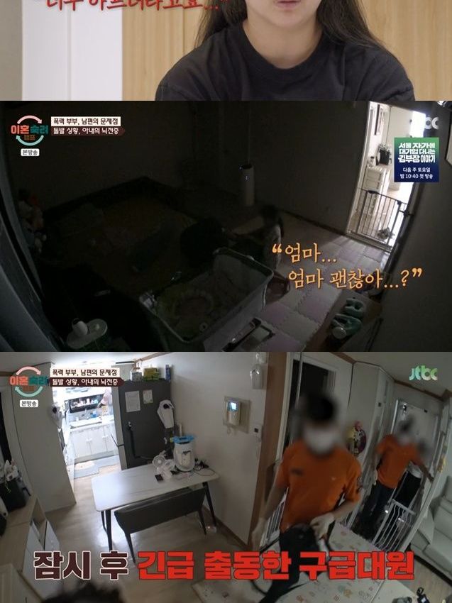 이후 집안에 설치된 관찰 카메라에는 아내의 뇌전증 전조 증상이 포착됐다. 첫째는 "엄마 괜찮냐"며 울음을 터뜨렸고, 아내의 발작하는 모습에 제작진은 급히 119에 신고했다.