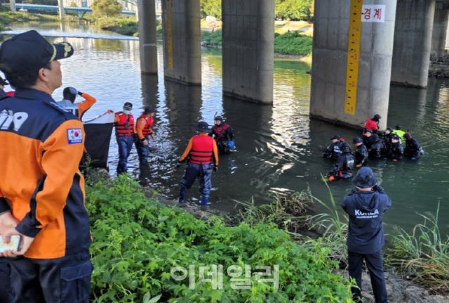 동막교 부근 하천 바닥에 엎드린채 가라앉아 있던 시신을 수색중이던 중앙119구조본부 수색팀 소속 다이버가 발견했다.