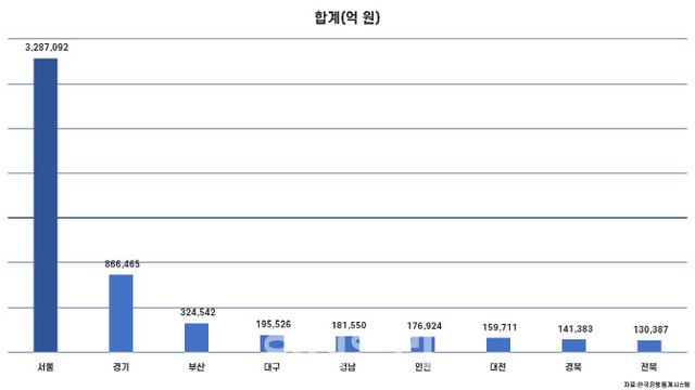 한국은행 경제통계시스템(ECOS)자료를 보면 2025년 7월 기준 서울의 원화예금은 약 1156조원으로 전국에서 압도적이다. 경기도는 304조원으로 서울의 4분의 1 수준이며, 부산 113조원, 대구 69조원, 경남과 인천은 각각 63조원에 그친다. 단기 유동성을 뜻하는 요구불예금은 서울이 17조 1000억원, 경기도 5조 5000억원으로 세 배 이상 차이 난다. 장기성 자금인 저축성예금 역시 서울 985조 원, 경기 249조 원으로 수도권 집중이 뚜렷하다. 전국 예금의 절반 이상이 서울에 몰려 있고, 주요 광역시는 서울의 10분의 1에도 미치지 못한다. 이는 표면적인 지역경제 격차가 아니라, 자본이 지방으로 확산되지 못하고 수도권, 특히 서울 중심으로 흡입되고 있음을 보여준다.